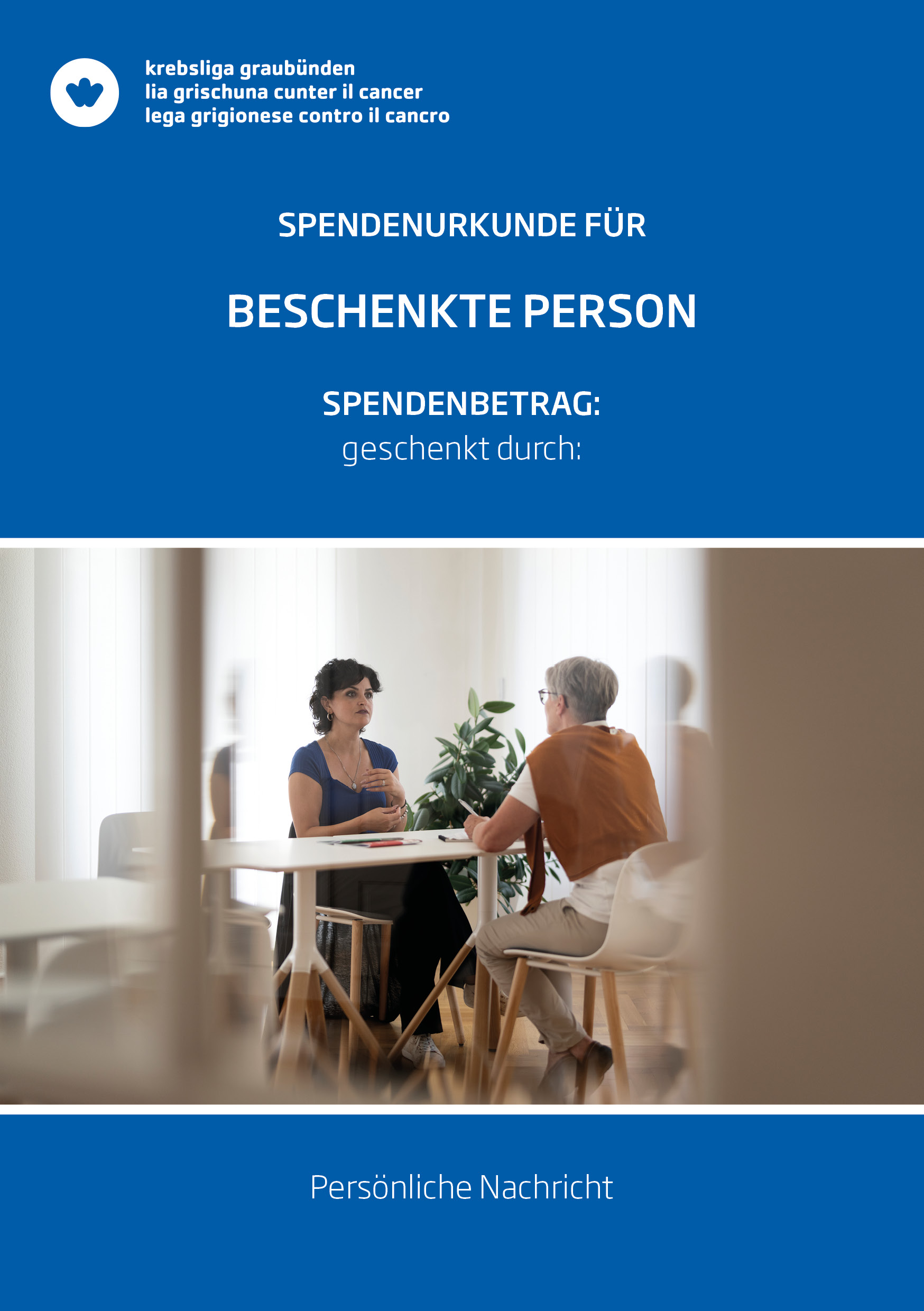 Kennen Sie das? Sie durchstöbern das Internet und Geschäfte nach einem besonderen Geschenk, finden jedoch nicht das, wonach Sie suchen. Sie wollen etwas Nützliches und Sinnvolles schenken, doch was? Hier hat Ihre Suche ein Ende. Schenken Sie eine Spende oder eine Mitgliedschaft für die Krebsliga Graubünden. Etwas, das nicht nur die beschenkte Person und Sie selber freut, sondern auch anderen Menschen hilft und somit dreifach ankommt. Ihr Geschenk wirkt dort, wo es gebraucht wird – im Alltag von Betroffenen und ihren Familien.